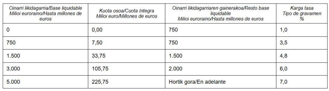 Por otra parte, la escala de gravamen se compone de cinco tipos de gravamen; el tipo inicial es del 1 por 100 para los primeros 750 millones de base liquidable, y alcanza el 7 por 100 para una base liquidable mínima de 5.000 millones.