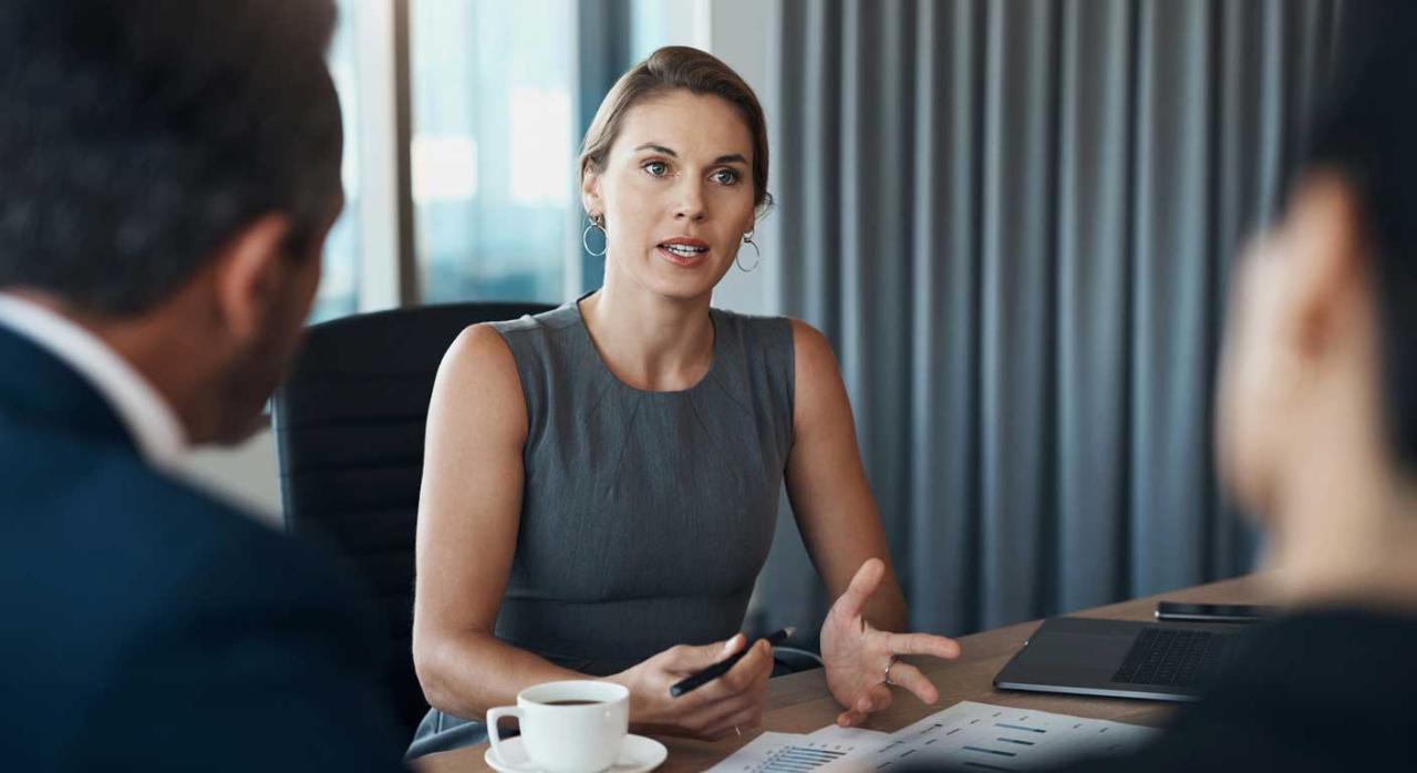 Deducción en el IRPF de los gastos de la vivienda alquilada afecta parcialmente a la actividad profesional de abogado a pesar de no haberla sujetado a IVA. Imagen de una reunión de trabajo en el que la mujer lleva la voz cantante
