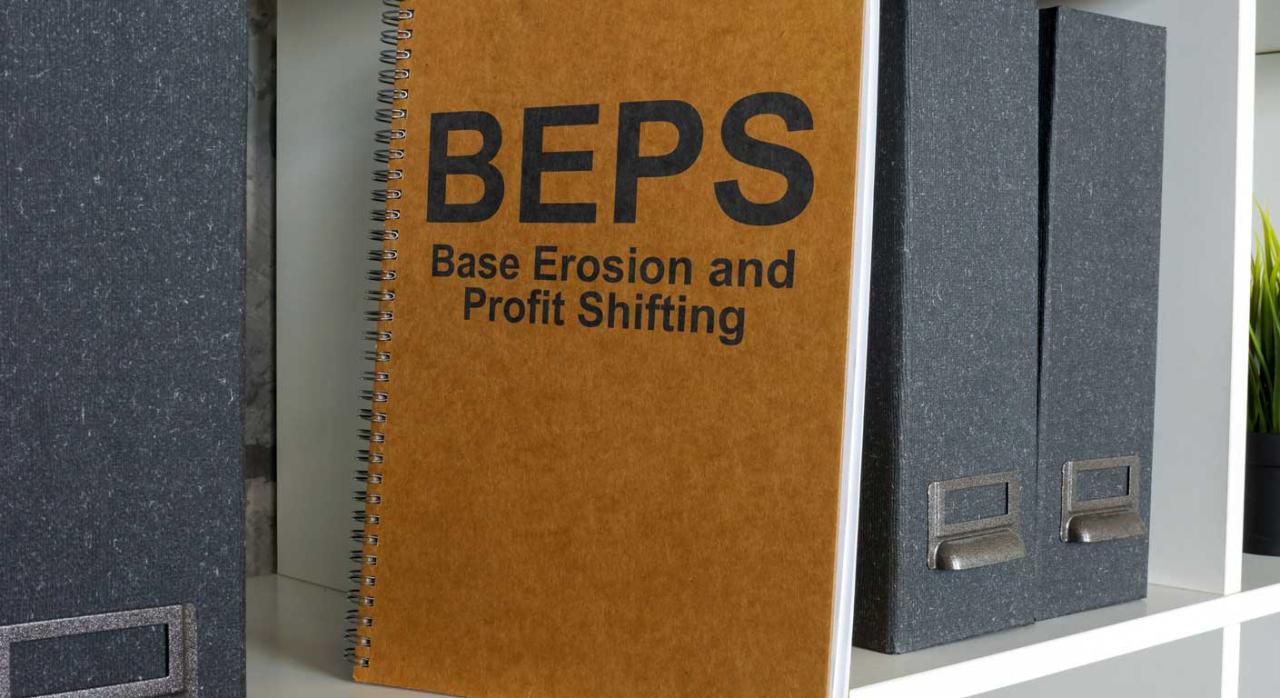 Acuerdo Multilateral entre Autoridades competentes sobre intercambio de información GloBE. Imagen de un libro en una estantería titulado BEPS: Erosión de la base imponible y traslado de beneficios