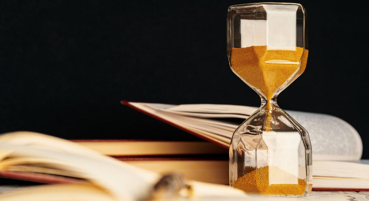 ISD: no se ha de presentar si no hay aceptación y la herencia yacente impide la prescripción. Imagen de reloj de arena de vidrio sobre mesa de madera con un libro abierto