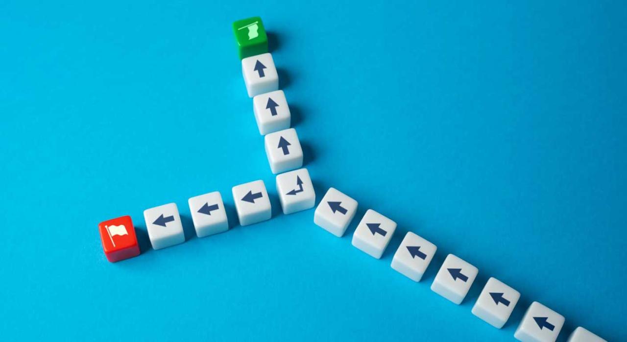 La DGT analiza un supuesto de escisión parcial, en el que una entidad transmite todos sus activos inmobiliarios a otra entidad, manteniendo los activos y pasivos no inmobiliarios. Imagen de una serie de flechas con dos caminos eligiendo el rojo o el verde