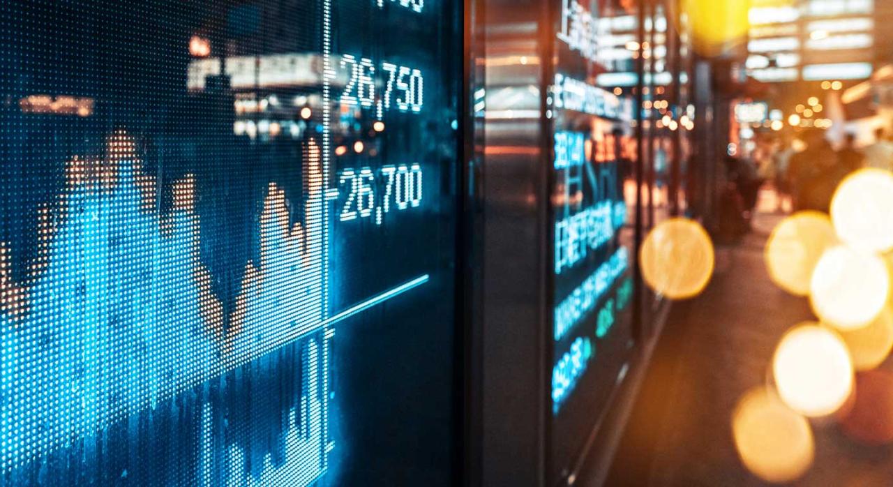 Proyecto de Orden que prevé cambios en los Modelos 780 y 781 del impuesto sobre el margen de intereses y comisiones de determinadas entidades financieras. Imagen de números bursátiles financieros y reflejos de la luz de la ciudad